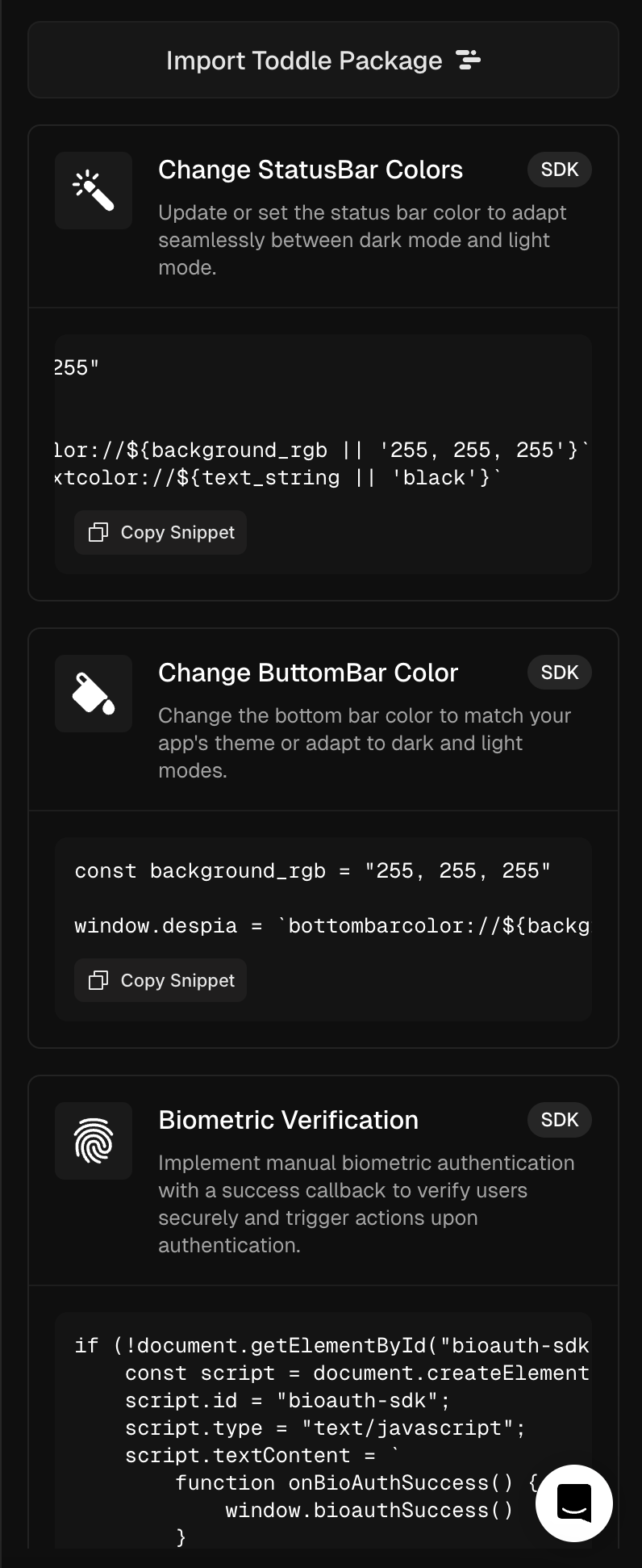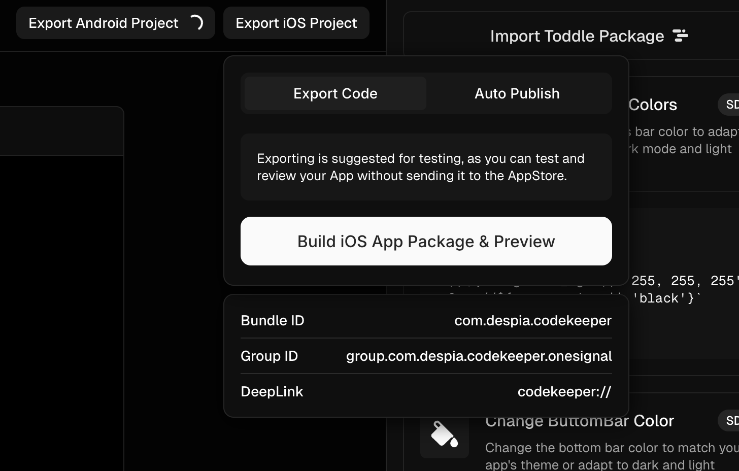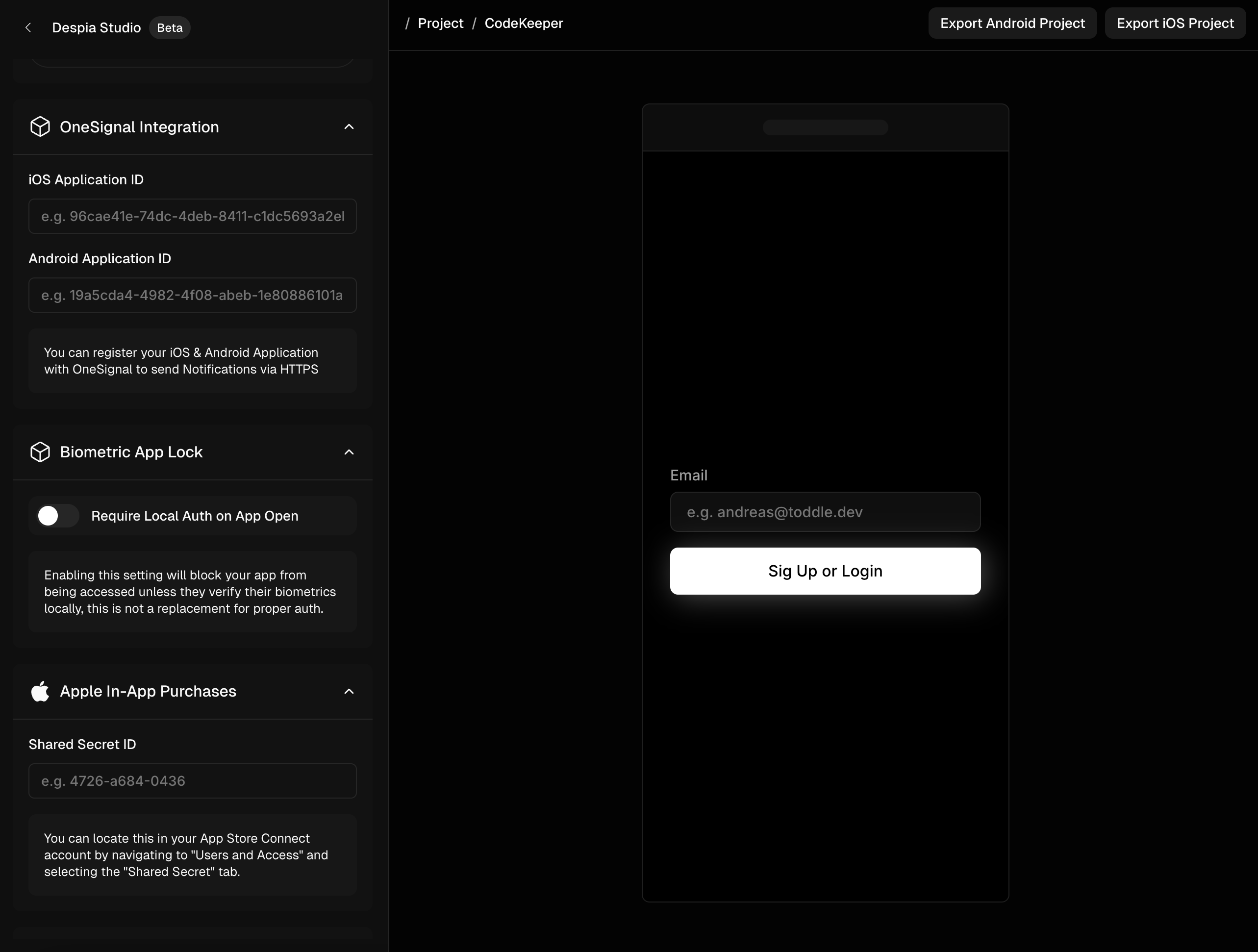 Configure Native Device Features: Access Despia's Native APIs in the right-side panel to set up device-specific functionality: