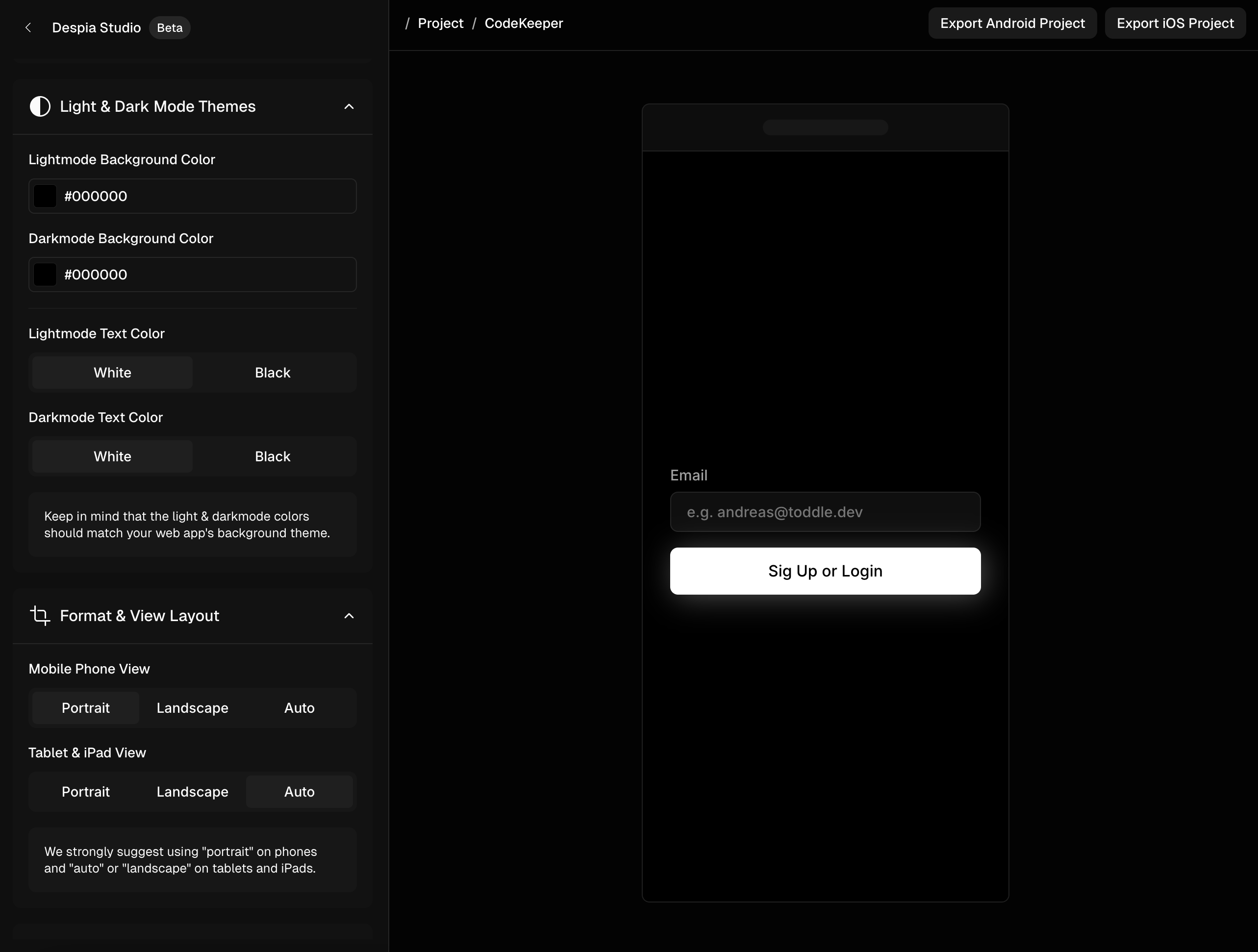 Android Theme Implementation Note: Unlike iOS, Android does not natively support dynamic light/dark mode switching through system settings. Android defaults to light mode, but you can implement iOS-style theme switching using Despia's Custom Actions feature. (See implementation example below)